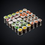Состав: лосось, тунец, угорь, креветка, груша, сыр “Cremette”, нори, рис.