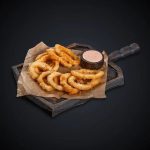 Креветки, корзинка из картофеля пай, соус Спайси, лимон, соус Васаби.