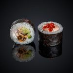 Состав: угорь, лосось копченый, авокадо, сыр “Cremette”, соус “Унаги”, кунжут, нори, рис.