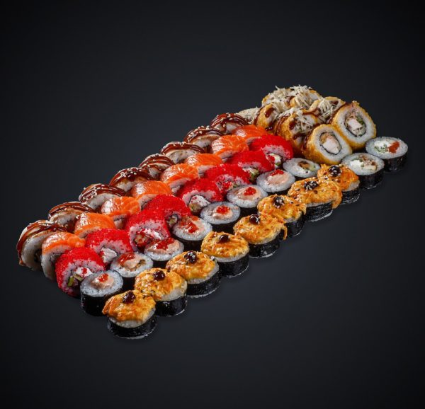 Состав: Угорь, лосось, тунец, копченая курица, мидии, креветки, копченый лосось, снежный краб, авокадо, огурец, нори, соус «Унаги», кунжут, рис.