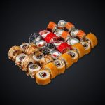 Лосось, тунец, огурец,сыр “Cremette”, соус Гавайский, соус Унаги, панировочные сухари, кляр, кунжут, нори, рис.
