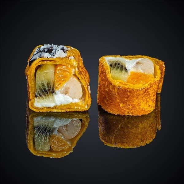 Блинчик, сырный крем, апельсин, киви, банан, кокосовая стружка, топпинг.