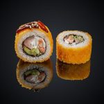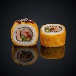 Лосось, авокадо, соус Спайси, соус Унаги, панировочные сухари, кляр, кунжут, нори, рис.