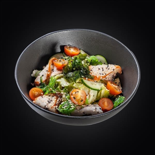 Состав: угорь, салат айсберг, помидоры черри, огурец, соус «Гамадари», водоросли вакамэ, кунжутное масло, чука, кунжут.