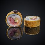 Лосось копченый, тунец, огурец, помидоры, майонез, соус Унаги, панировочные сухари, кляр, кунжут, нори, рис.