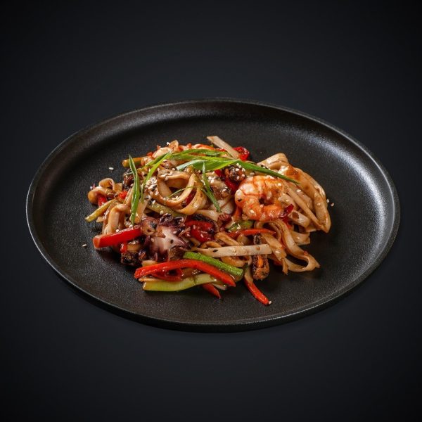 Креветка, кальмар, осьминог, мидии, лапша рисовая, кабачок, перец болгарский, лук зеленый, лук репчатый, соус Терияки, соевый соус, кунжут.