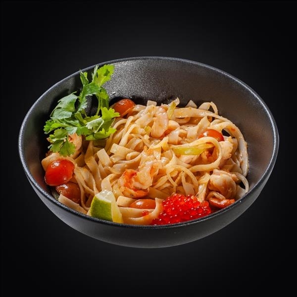Креветки, икра красная, кабачки, лук репчатый, масло растительное, паста «Том Ям», сливки, помидоры черри, кинза, лайм, лапша удон.