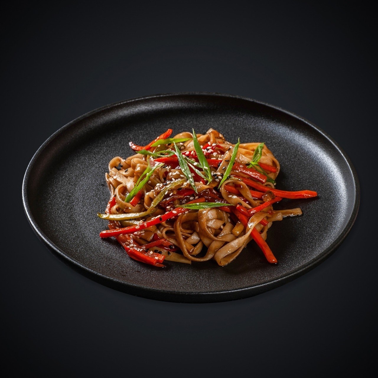 Кабачок, перец болгарский, морковь, лапша гречневая, лук зеленый, лук репчатый, соус Терияки, соевый соус, корень имбиря, чеснок, кунжут.