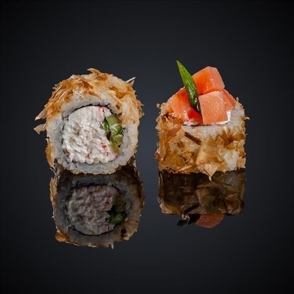 Состав: лосось копченый, снежный краб, майонез, огурец, сыр “Cremette”, стружка тунца, лук зеленый, соус “Бальзамический”, нори, рис.