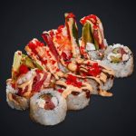 Состав: Лосось, креветка, тунец, сыр «Cremette», огурец, авокадо, икра масаго, зеленый лук, соус «Унаги», соус «Спайс», нори, рис
