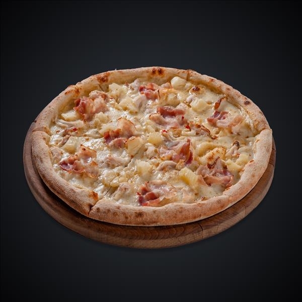 Состав: курица копчёная, бекон, ананас, сыр моцарелла, сливочный соус.