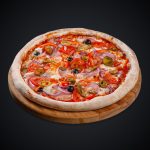 Состав: куриное филе, пепперони, краковская колбаса, охотничьи колбаски, свиной ростбиф, огурцы маринованные, пармезан, моцарелла, лук фри, соус сливочный.