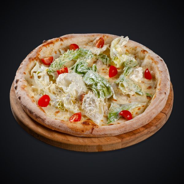 Состав: соус сливочный, куриное филе, моцарелла, пармезан, черри, айсбер, соус Цезарь