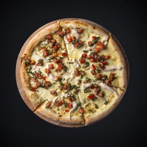 Состав: соус томатный, сыр моцарелла, куриное филе, ветчина индейки, помидоры, лук красный, маслины, перец болгарский, перец халапеньо.