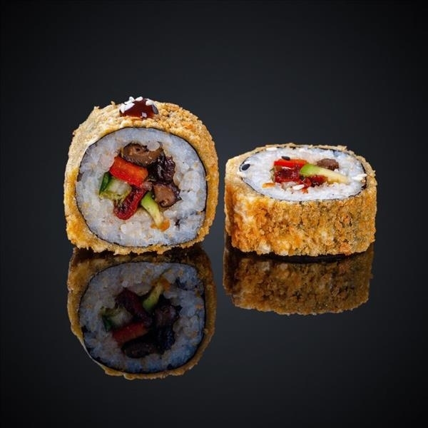 Грибы Шиитаке, авокадо, огурец, помидоры, перец болгарский, салат Айсберг, соус Унаги, панировочные сухари, кляр, кунжут, нори, рис.