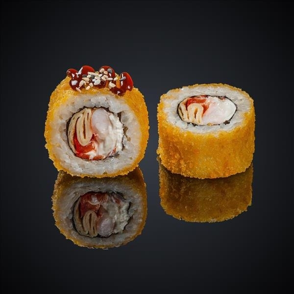 Креветка, тамаго, перец болгарский, сыр “Cremette”, соус “Унаги”, панировочные сухари, кляр, кунжут, нори, рис.