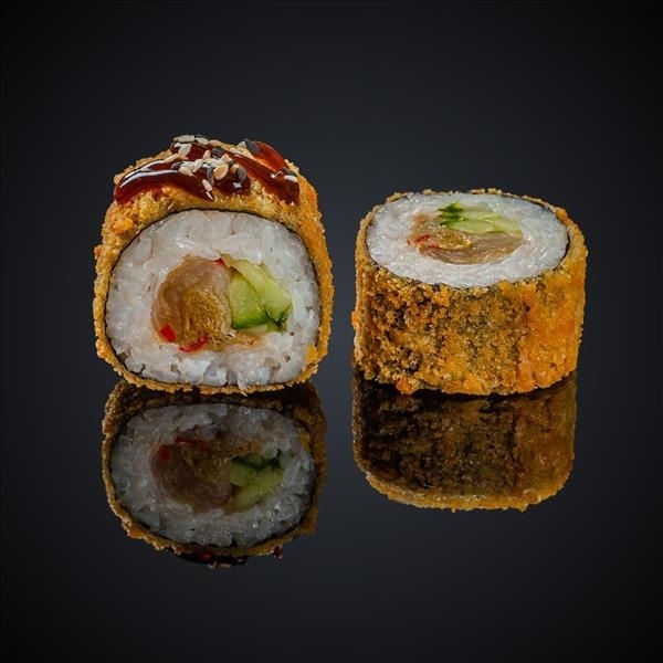 Угорь, креветка, авокадо, огурец, сыр “Cremette”, соус Спайси, соус Унаги, икра Масаго, панировочные сухари, кляр, кунжут, нори, рис.