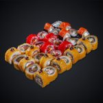 Состав: лосось, угорь, креветка, тунец, сыр «Cremette», манго, огурец, авокадо, икра масаго, соус «Унаги», соус «Спайси», нори, рис.