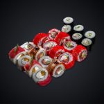Состав: лосось, угорь, креветка, тунец, сыр «Cremette», манго, огурец, авокадо, икра масаго, соус «Унаги», соус «Спайси», нори, рис.