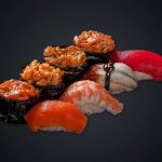 Состав: Лосось, угорь, тунец, креветки темпура, креветки варёные, снежный краб, сыр «Cremette», сыр Моцарелла, авокадо, огурец, салат айсберг, манго, зелёный лук, икра масаго, соус «Гавайский», соус «Спайси», соус «Унаги», кляр, кунжут, нори, рис.