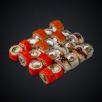 Состав: лосось, угорь, тунец, лосось копченый, креветка, креветка в темпуре, снежный краб, мидии, авокадо, сыр “Cremette”, нори, рис.