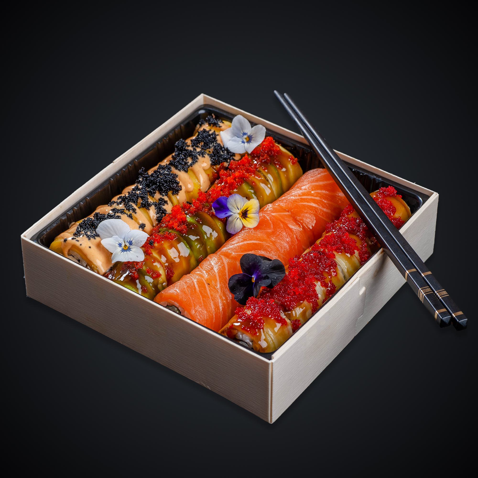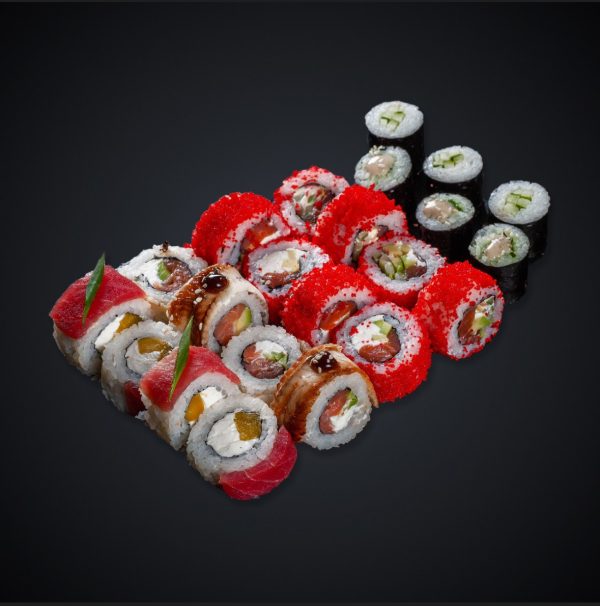 Состав: лосось, угорь, креветка, тунец, сыр «Cremette», манго, огурец, авокадо, икра масаго, соус «Унаги», соус «Спайси», нори, рис.
