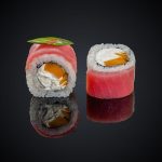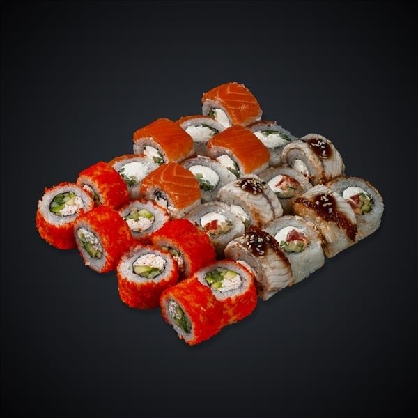 Состав: Филадельфия классик — 1/2, Филадельфия с креветкой — 1/2, Ролл с авокадо — 1/2, Ролл с огурцом — 1/2 .