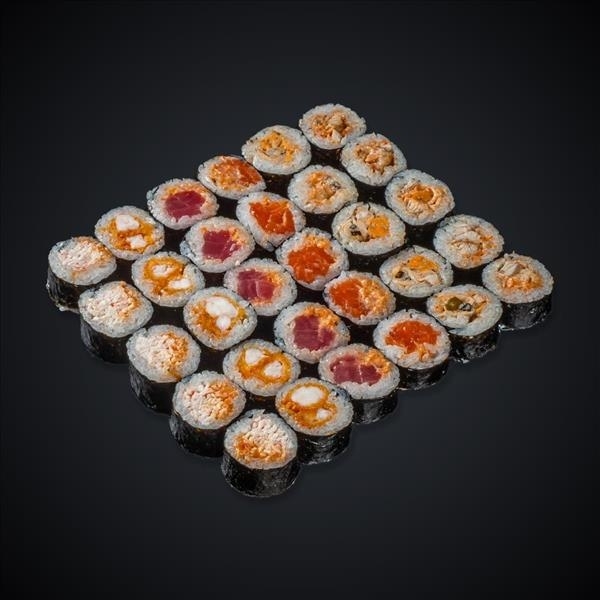 Состав: Лосось, угорь, тунец, мидии, креветка в темпуре, снежный краб, соус “Спайси”, нори, рис.