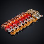Состав: лосось, угорь, креветка, тунец, сыр «Cremette», манго, огурец, авокадо, икра масаго, соус «Унаги», соус «Спайси», нори, рис.