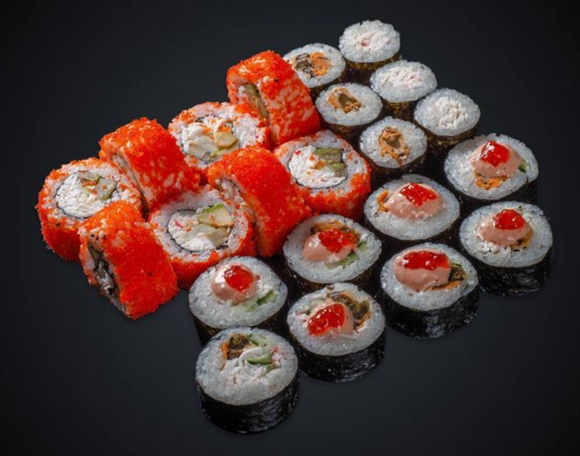 Состав: Калифорния — 1, ролл с мидиями — 1/2, ролл со снежным крабом — 1/2, Средиземноморский