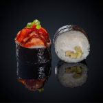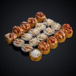 Состав: Шикарная креветка — 1, Пикантный тунец — 1, Запеченный с лососем — 1, Японский краб — 1