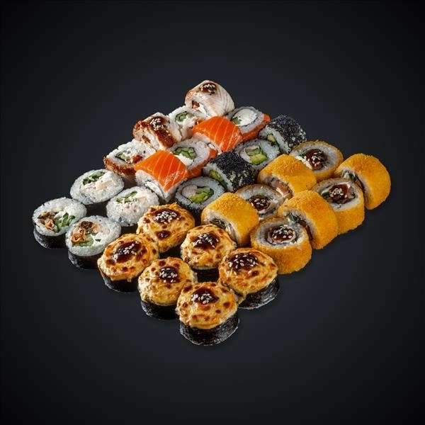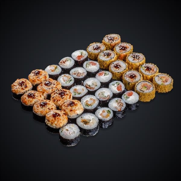 Состав: лосось, угорь, тунец, лосось копченый, креветка, креветка в темпуре, снежный краб, мидии, авокадо, сыр “Cremette”, нори, рис.