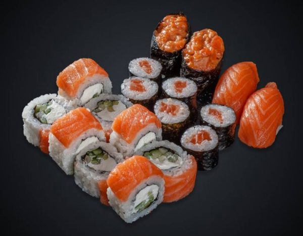 Состав: Филадельфия классик, ролл с лососем, гункан с лососем — 2 шт, суши с лососем — 2 шт