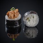 Состав: лосось копченый, угорь, лосось, огурец, сыр “Cremette”, соус “Унаги”, кунжут, нори, рис.