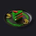 хрустящая миндальная основа с нежным фисташковым франжипаном, слоем кислосладкого малинового конфитюра и шоколадным ганашом, дополненным хрустящей фисташковой крошкой
